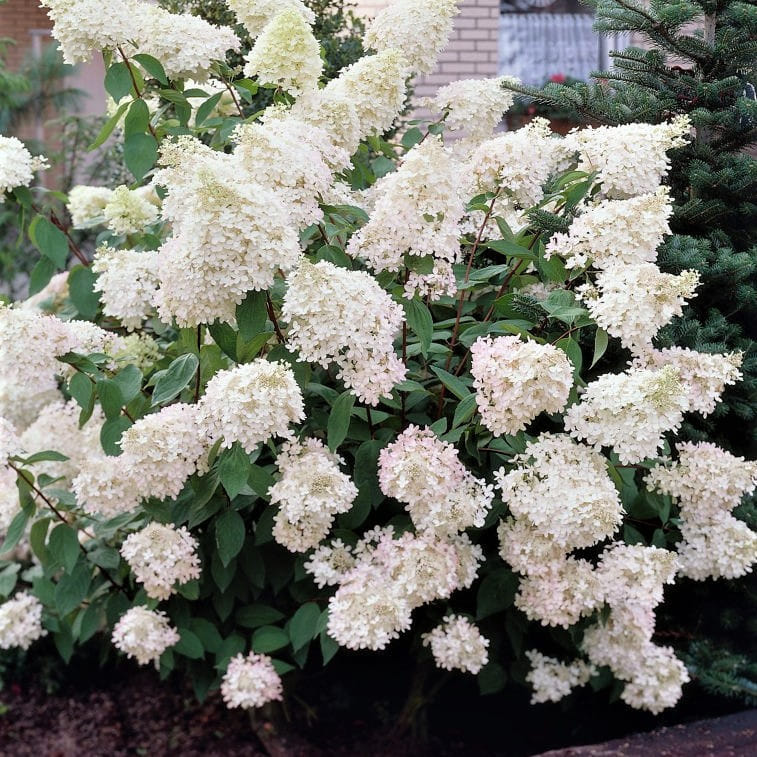 Цветущая Гортензия Фантом вызывает неподдельное восхищение. С июня по сентябрь ее побеги украшают большие плотные соцветия пирамидальной формы, которые могут достигать величины 30 см. Сами цветки крупные, стерильные, источают сладкий аромат меда, который можно ощутить на большом расстоянии от цветущего куста. Оттенок цветков меняется в зависимости от фазы цветения. В начале они сливочно-белые или кремовые, но постепенно к осени цвет меняется до светло-розового. Цветки этого сорта считаются самыми крупными из всех метельчатых гортензий. Полноценного цветения можно ожидать на 4-5 год.