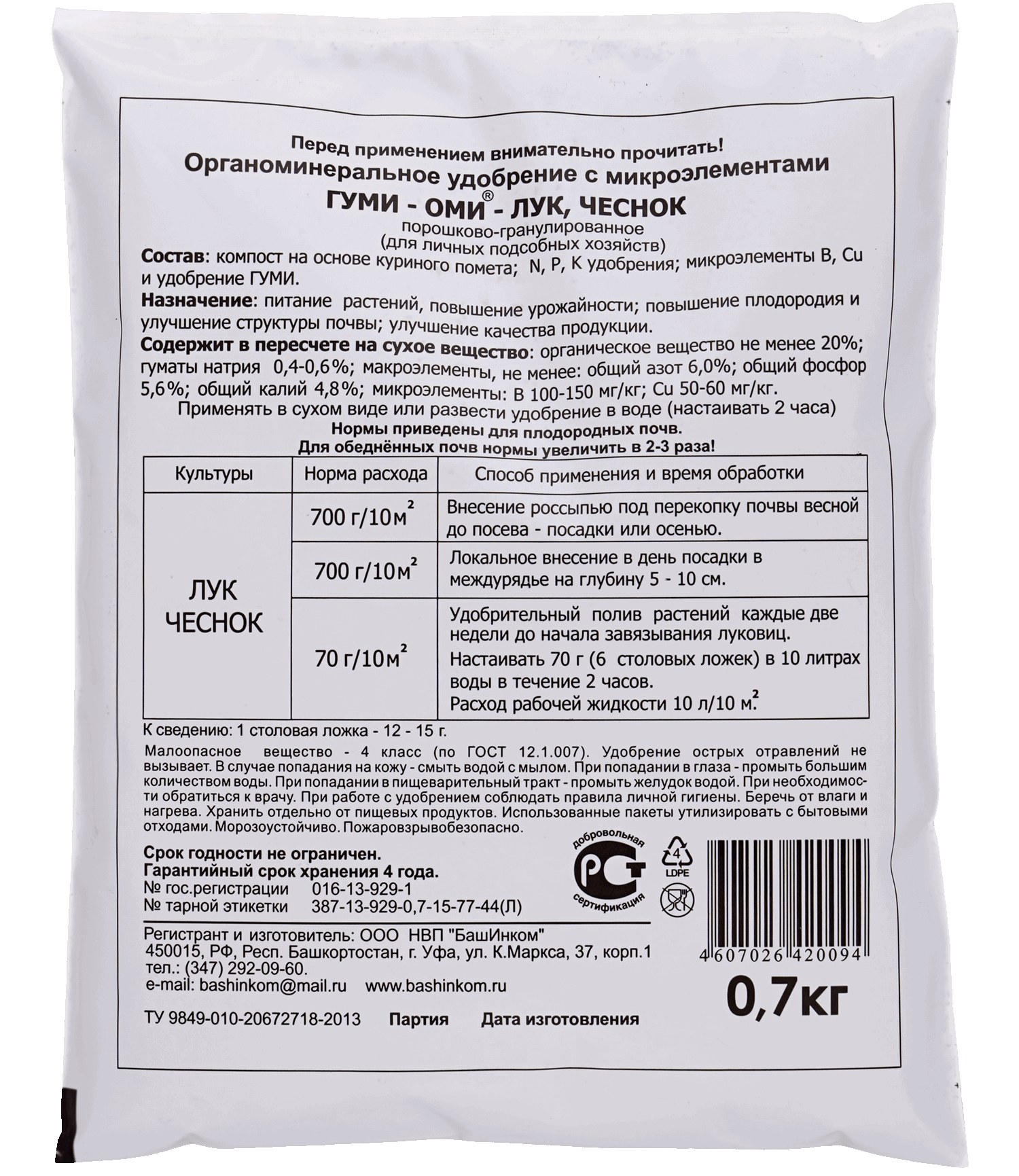 Порошково–гранулированное удобрение с необходимыми для питания лука и чеснока макро- и микроэлементами и эликсиром плодородия Гуми. Повышает урожайность, плодородие, улучшает структуру почвы и улучшает качество продукции.