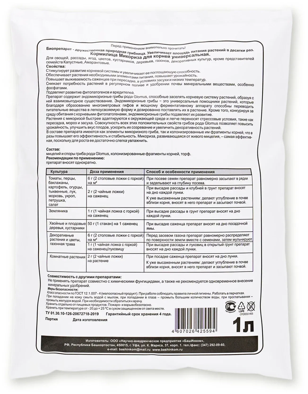 В составе препарата имеются как элементы микоризного гриба, так и колонизированные им фрагменты корней, что в разы повышает его эффективность и стабильность.Кормилица Микориза для корней рекомендован для всех садово-огородных и декоративных культур, кроме представителей семейств крестоцветные (редис, капуста, горчица, репа, редька, кресс-салат и другие) и марьевые (свекла, шпинат и другие), так как данные группы растений не способны вступать в подобные отношения. Более 90 % растений микоризируются. В составе препарата имеются как элементы микоризного гриба, так и колонизированные им фрагменты корней, что в разы повышает его эффективность и стабильность. Подавляет развитие фитопатогенов и вредителей. Снижает потребность растений в регулярном поливе и удобрении почвы минеральными веществами, особенно фосфатами. Повышает выживаемость саженцев при пересадке, в условиях засухи и низких температур.