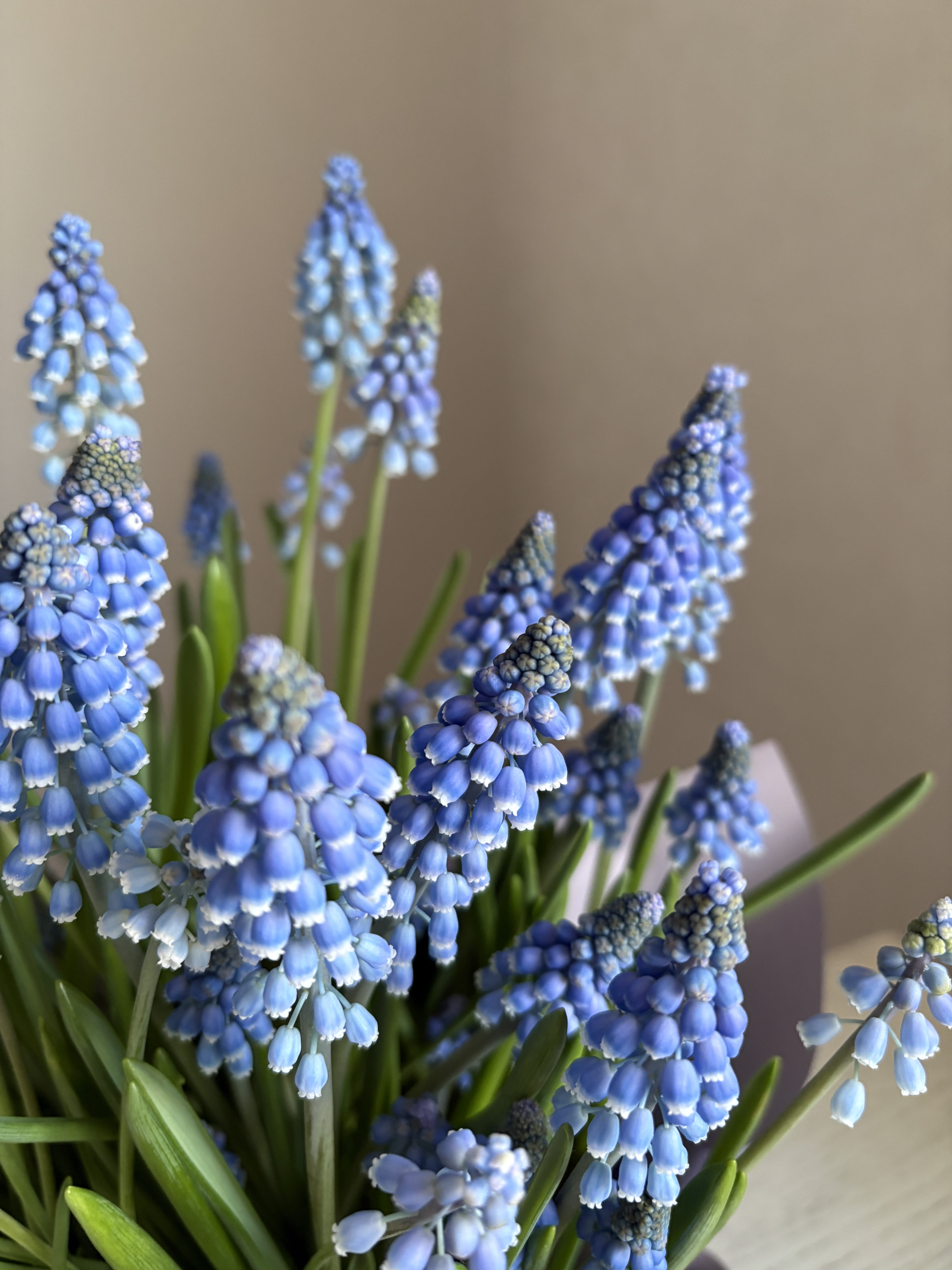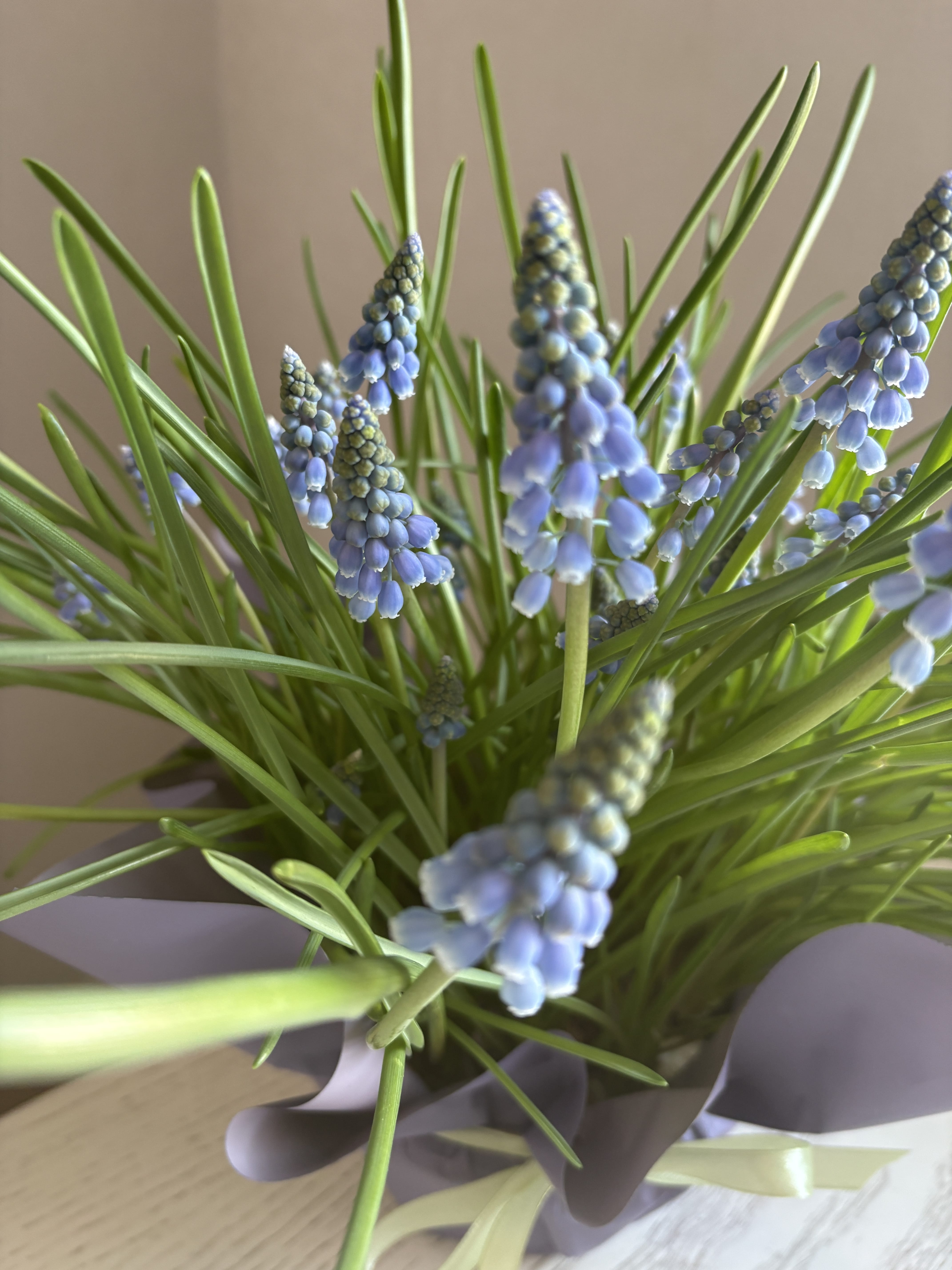Очень красивые нежные мускари в горшке диаметром 16 см. Луковицы (13-14 шт) после цветения можно высадить в сад.