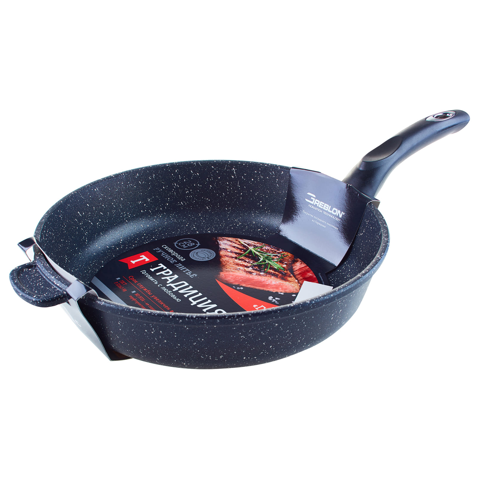 Сковорода литая серии Гранит ТМ Традиция диаметром 28 см, прекрасный вариант для приготовления различных блюд! В ней можно пожарить яйца, мясо, рыбу или овощи.