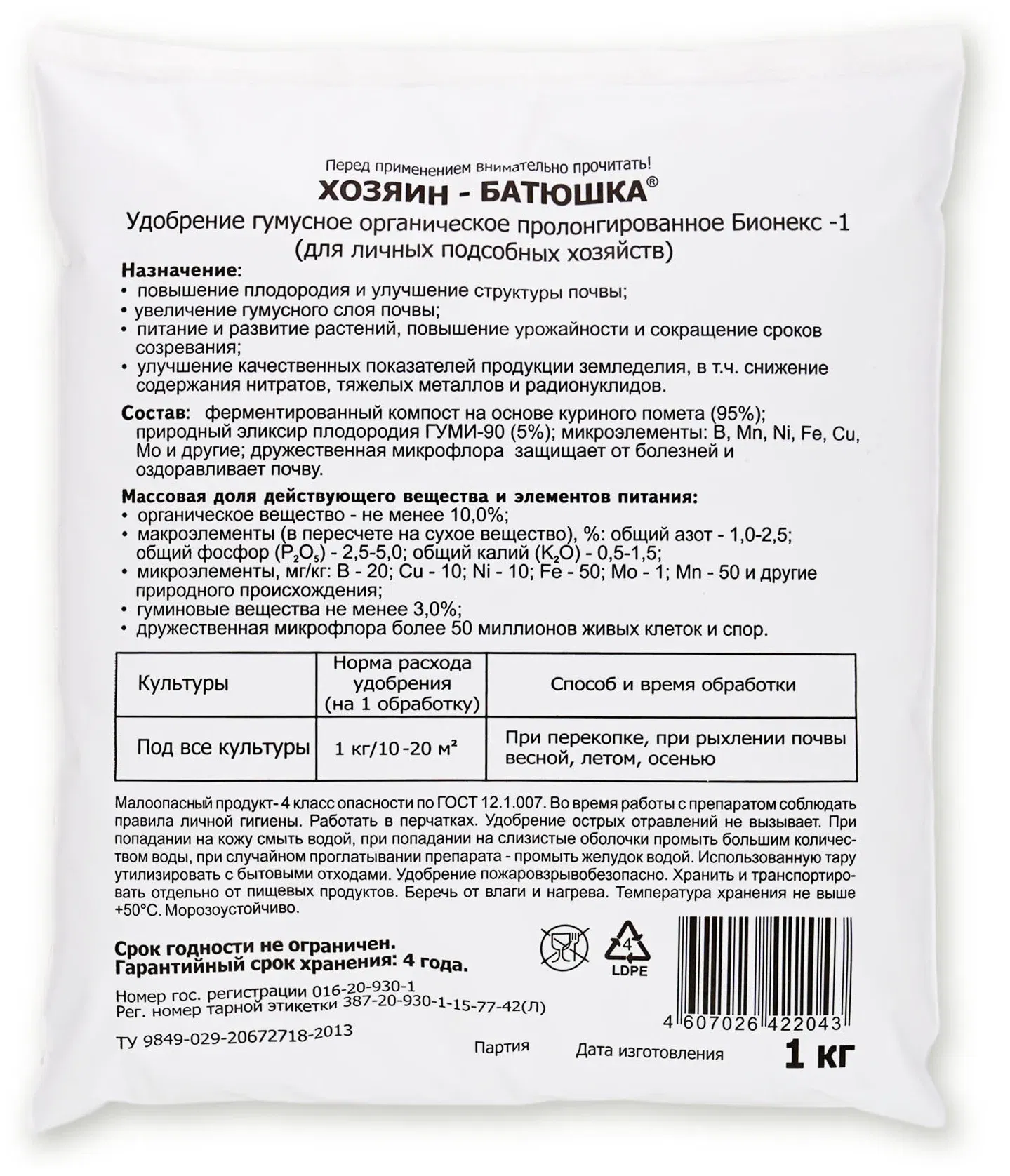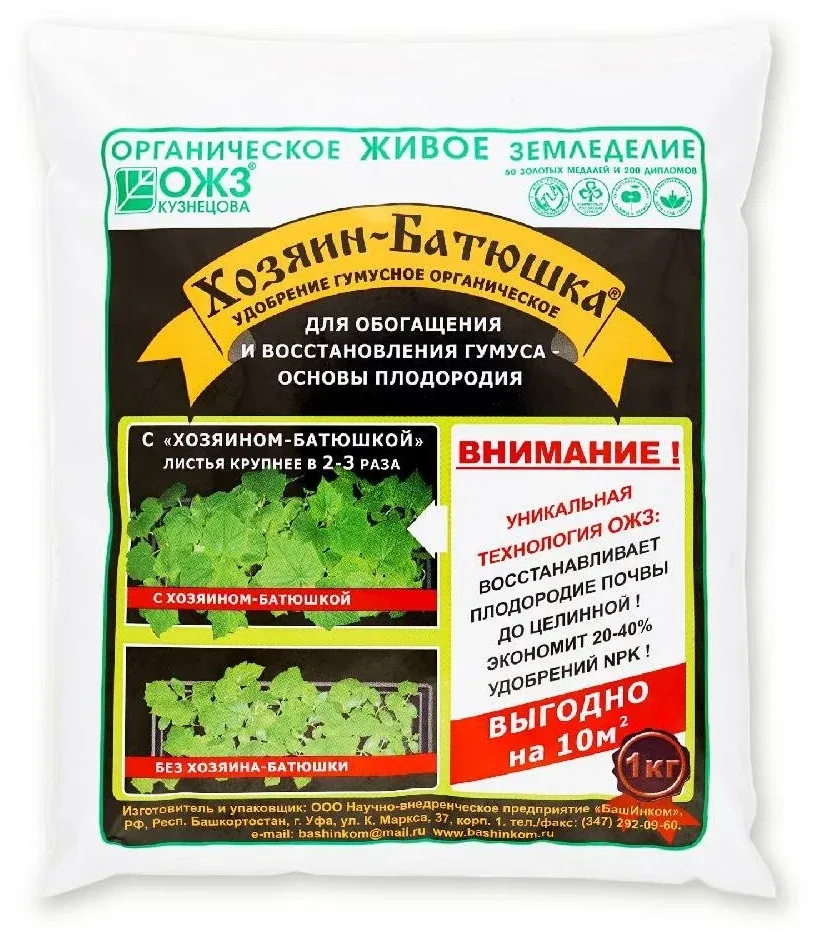 Природный гумусный препарат длительного (пролонгированного) действия. Для мощного повышения плодородия почвы и урожайности, увеличения гумусного слоя, улучшения структуры почвы, повышения эффективности питания растений, снижение нитратов и нейтрализации тяжелых металлов и др. вредных веществ, оздоровления почвы, активизации полезной почвенной микрофлоры и ликвидации усталости почвы.